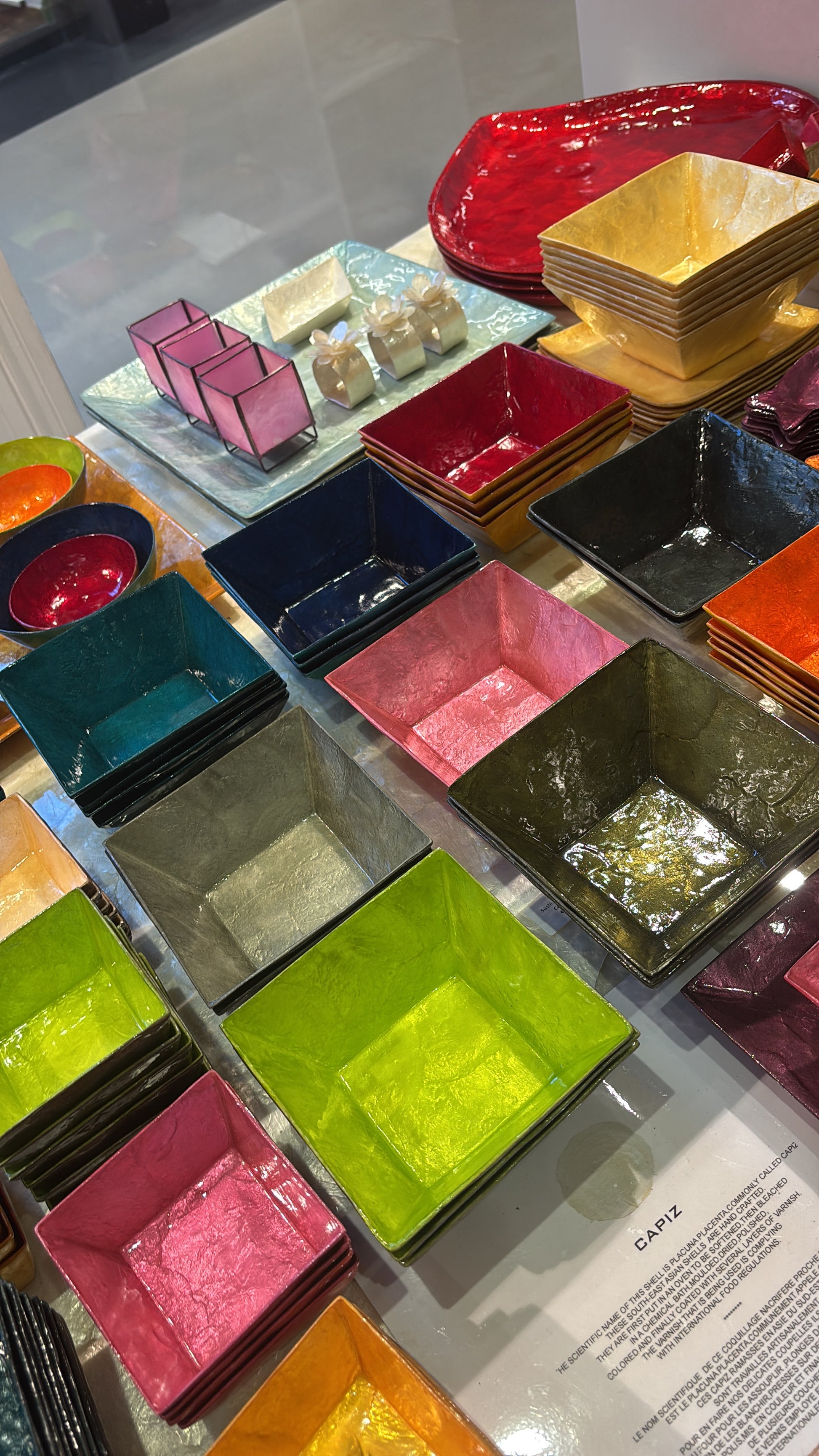 These square Capiz shell bowls are available in three sizes, making them perfect for versatile serving and layered table styling. Ideal for aperitifs, snacks, nuts, or sweets, they combine practical use with a refined, handcrafted look. The food-safe lacquer enhances the natural shimmer of the Capiz shell and adds an elegant touch to any setting.