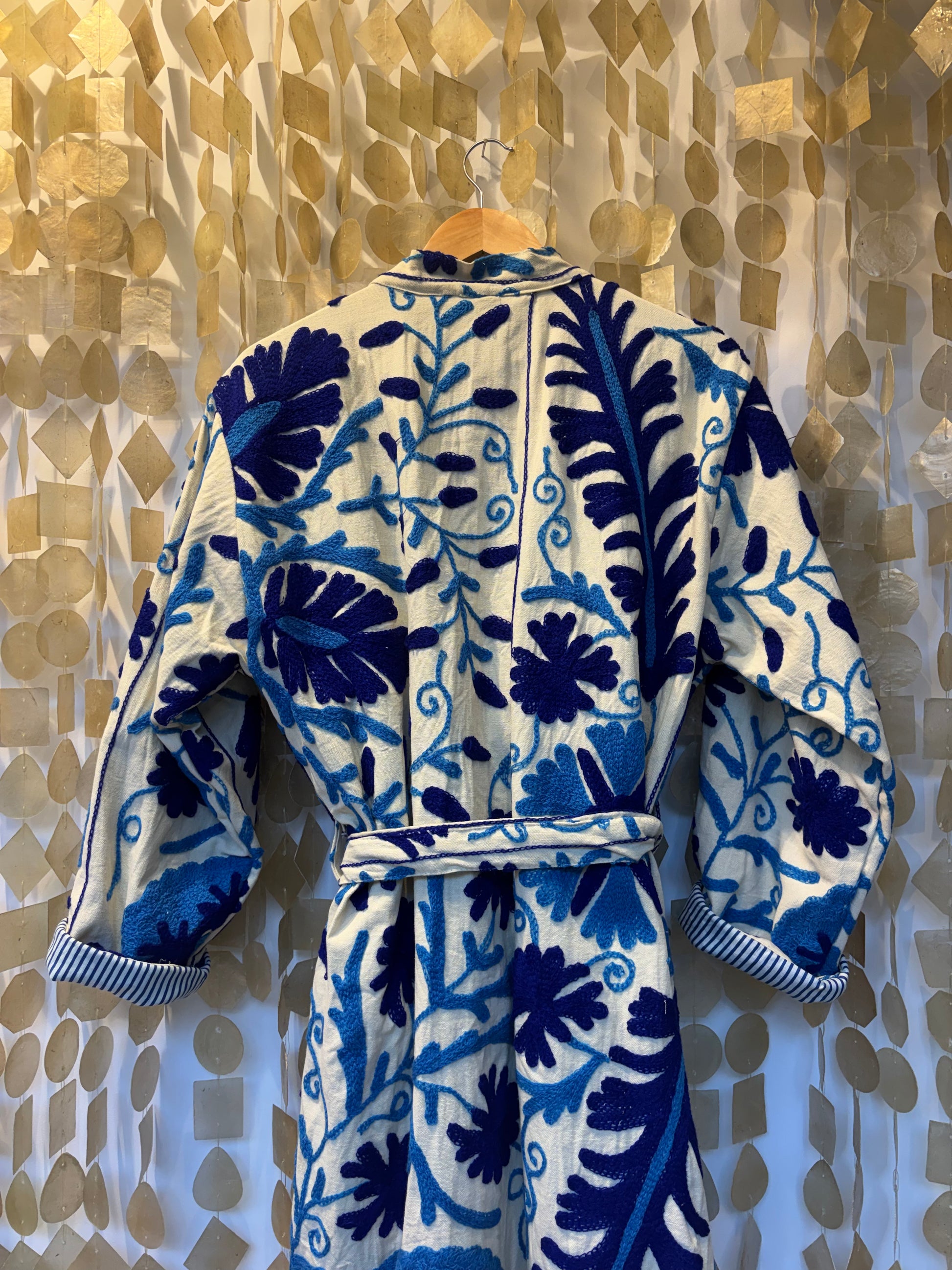 This handcrafted Suzani coat is a unique statement piece, made using traditional textile techniques. The coat features a rich blue floral pattern on a natural base, inspired by classic Suzani embroidery designs. Fully lined for comfort and durability, it offers both warmth and an elevated artisanal look.
