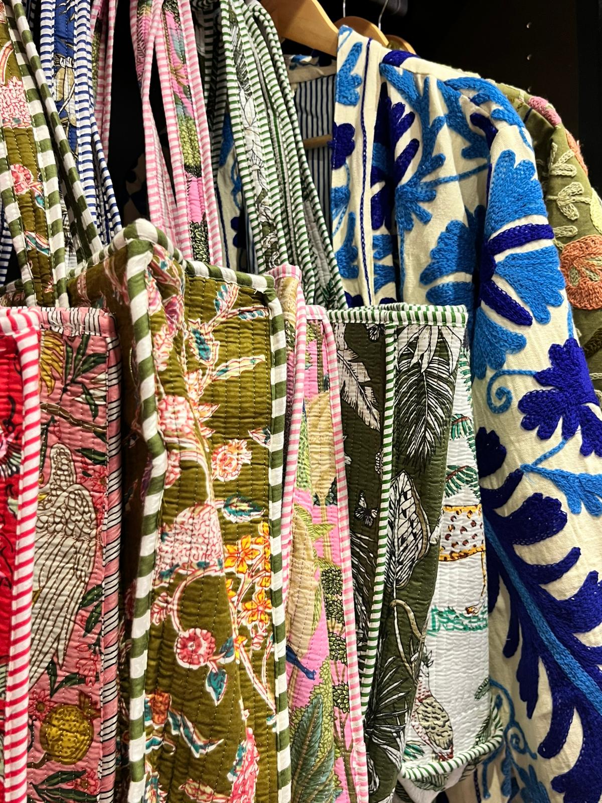 Crafted from 100% cotton, spacious quilted tote. The bag is fully padded for a soft, durable structure and includes a striped interior lining with a convenient pocket for essentials.