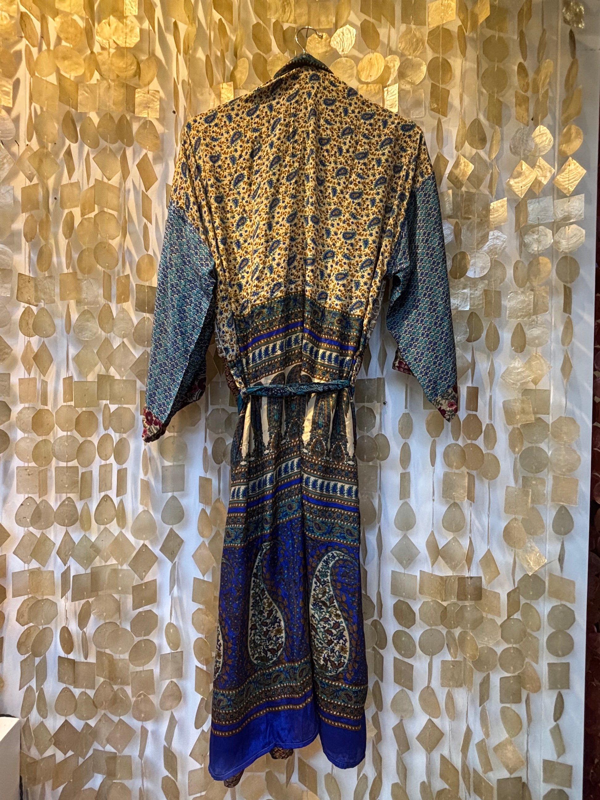 Designed in a relaxed, one-size fit, this robe features wide sleeves and a matching tie belt that allows for adjustable styling. Each piece is made from carefully selected silk panels, creating a unique patchwork effect. Variations in color and pattern are part of the design and ensure that every robe has its own character.