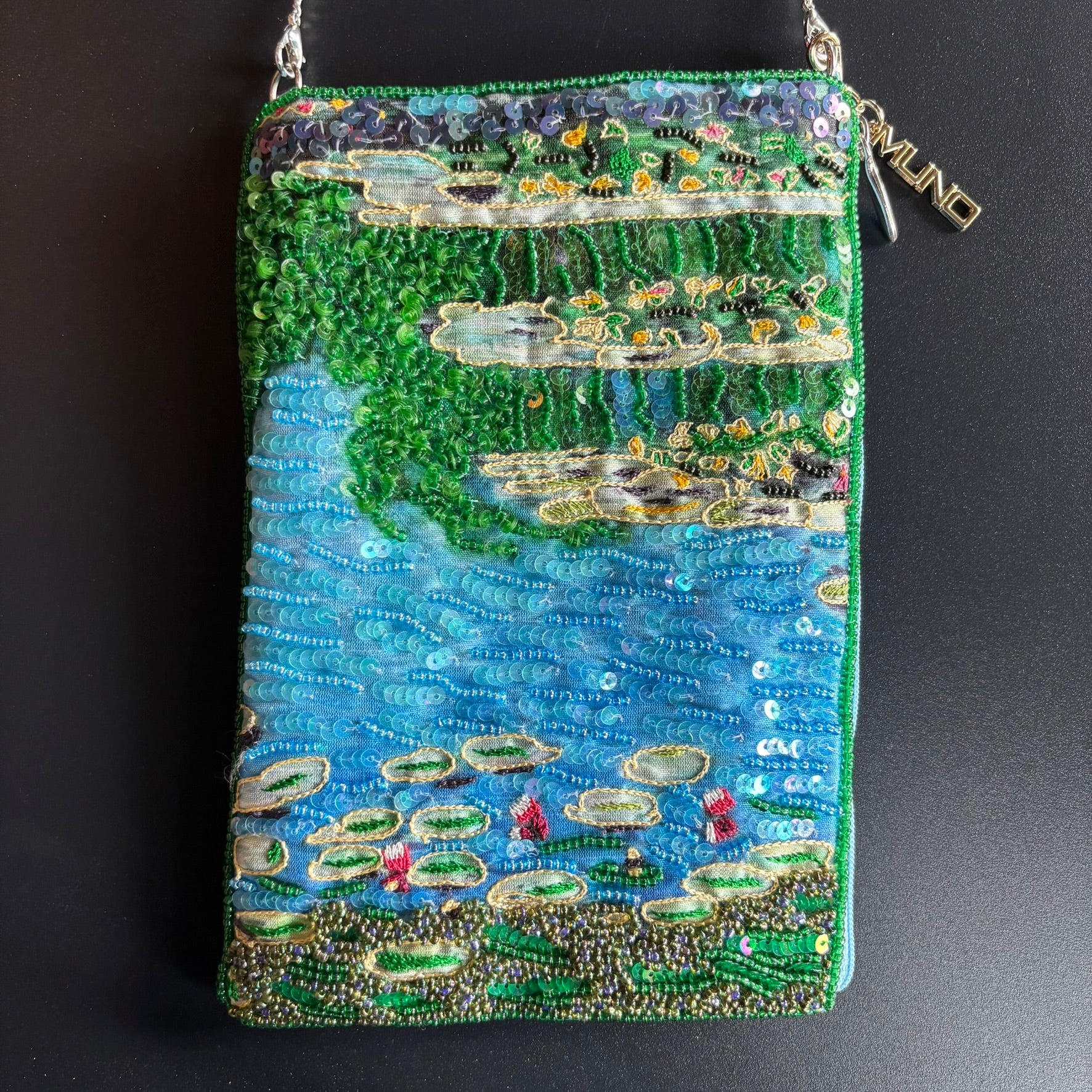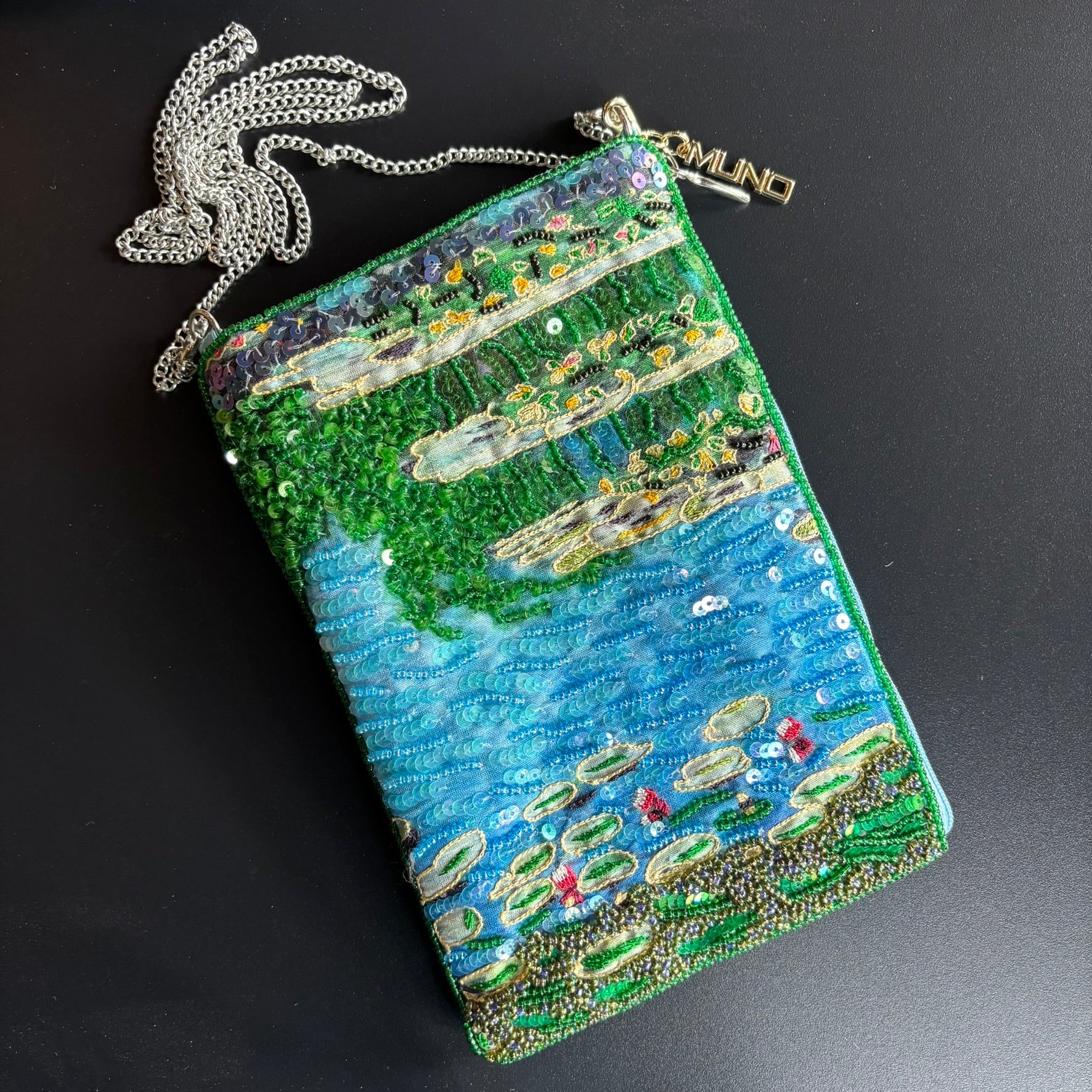 Inspired by Monet’s serene water lily paintings, this silk mini bag captures the poetry of shimmering reflections and lush greenery. The hand embroidery, enriched with sequins and pearls, creates depth and movement across the surface, echoing the brushstrokes of Impressionist art. Designed with a 110 cm chain strap, a secure top opening, and an additional side zip with a fully closed inner pocket, it balances artistry with function.