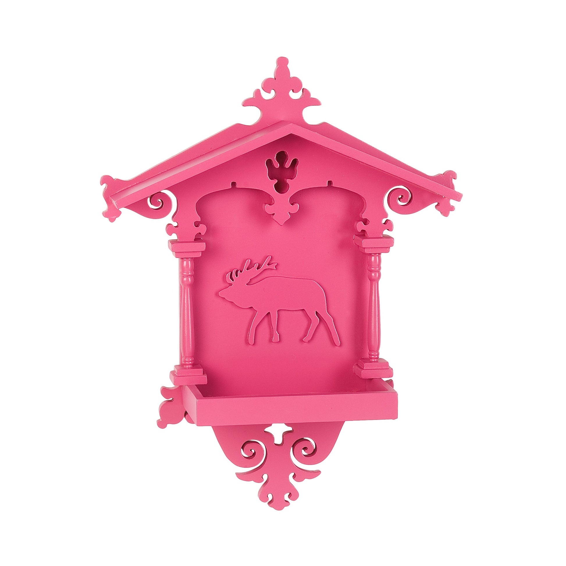 Vogelvoederhuisje met uitgesneden hertenpatroon in fushia hout.