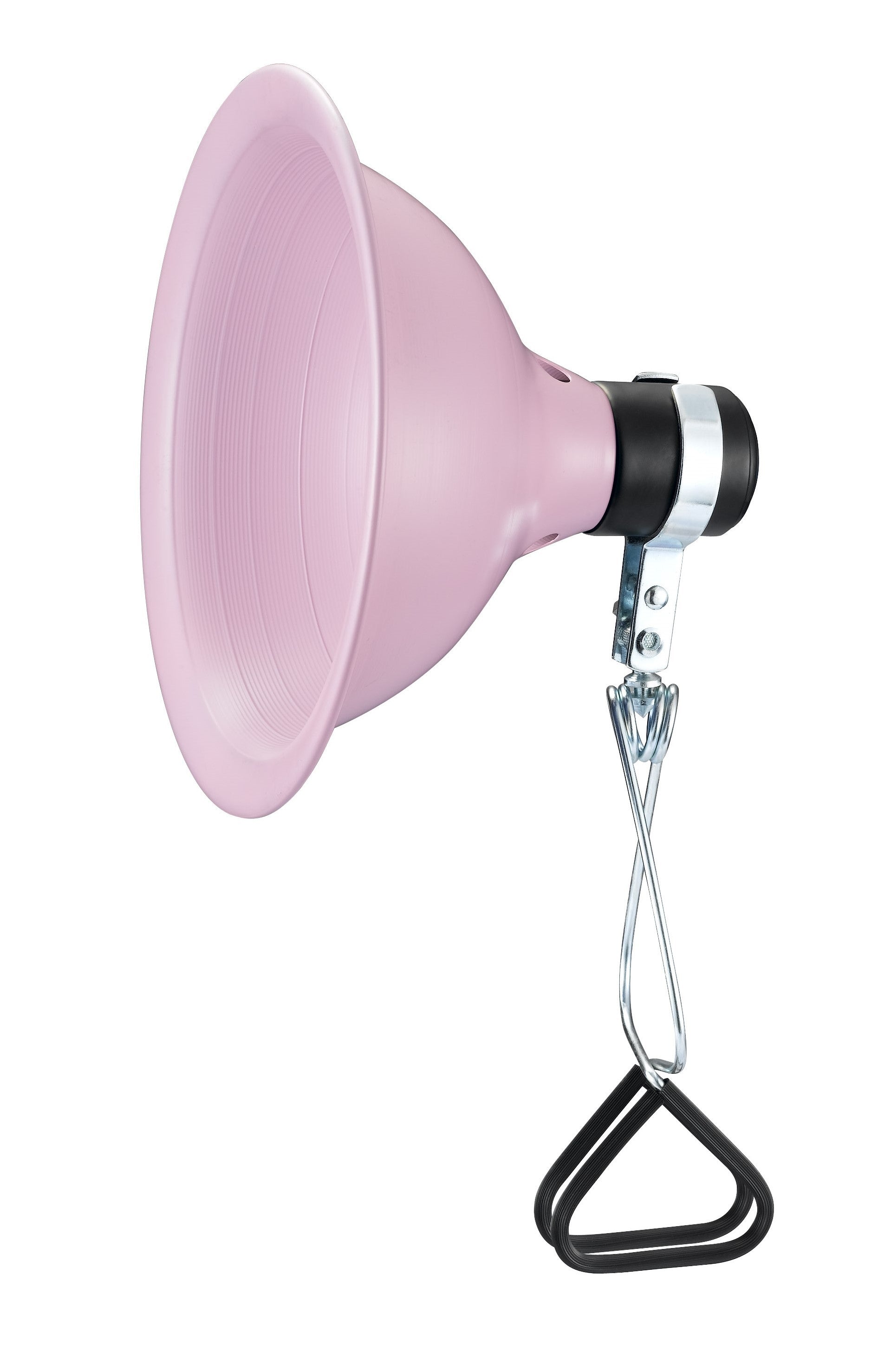 Roze metalen klemlamp met geassorteerd gekleurde draad omwikkeld snoer.