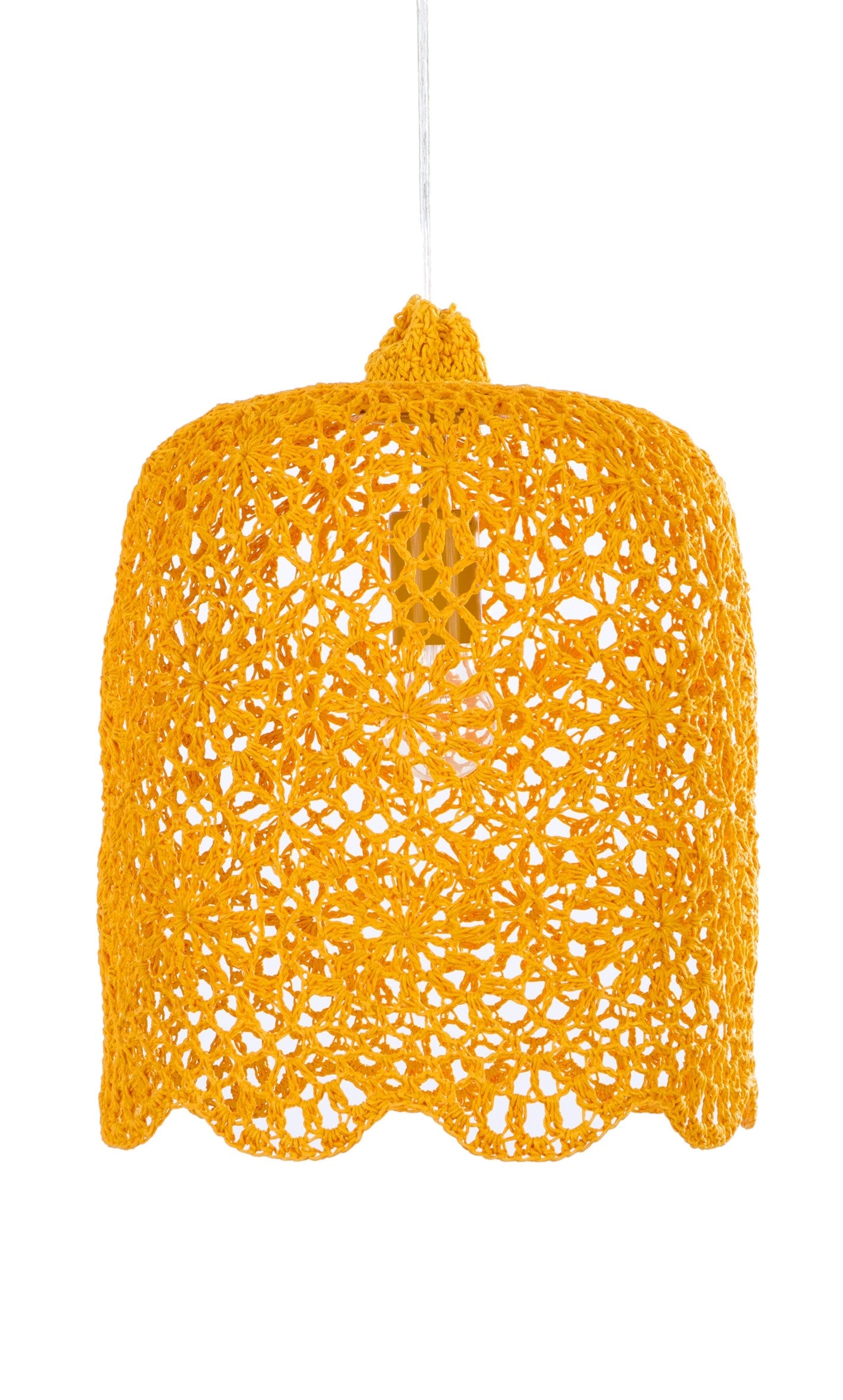 Handgemaakte gehaakte gele hanglamp.