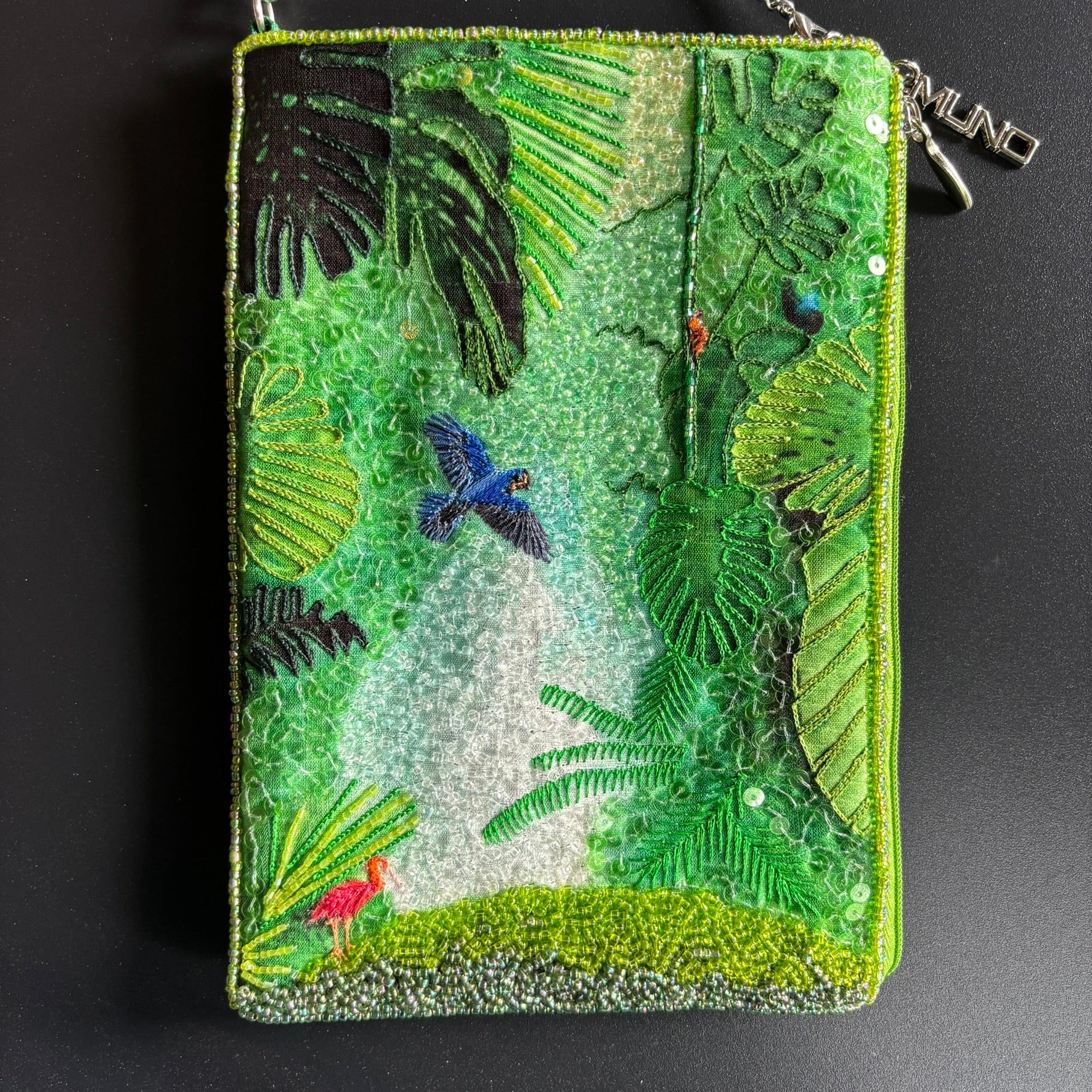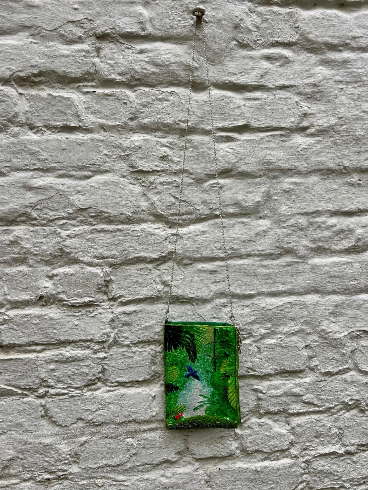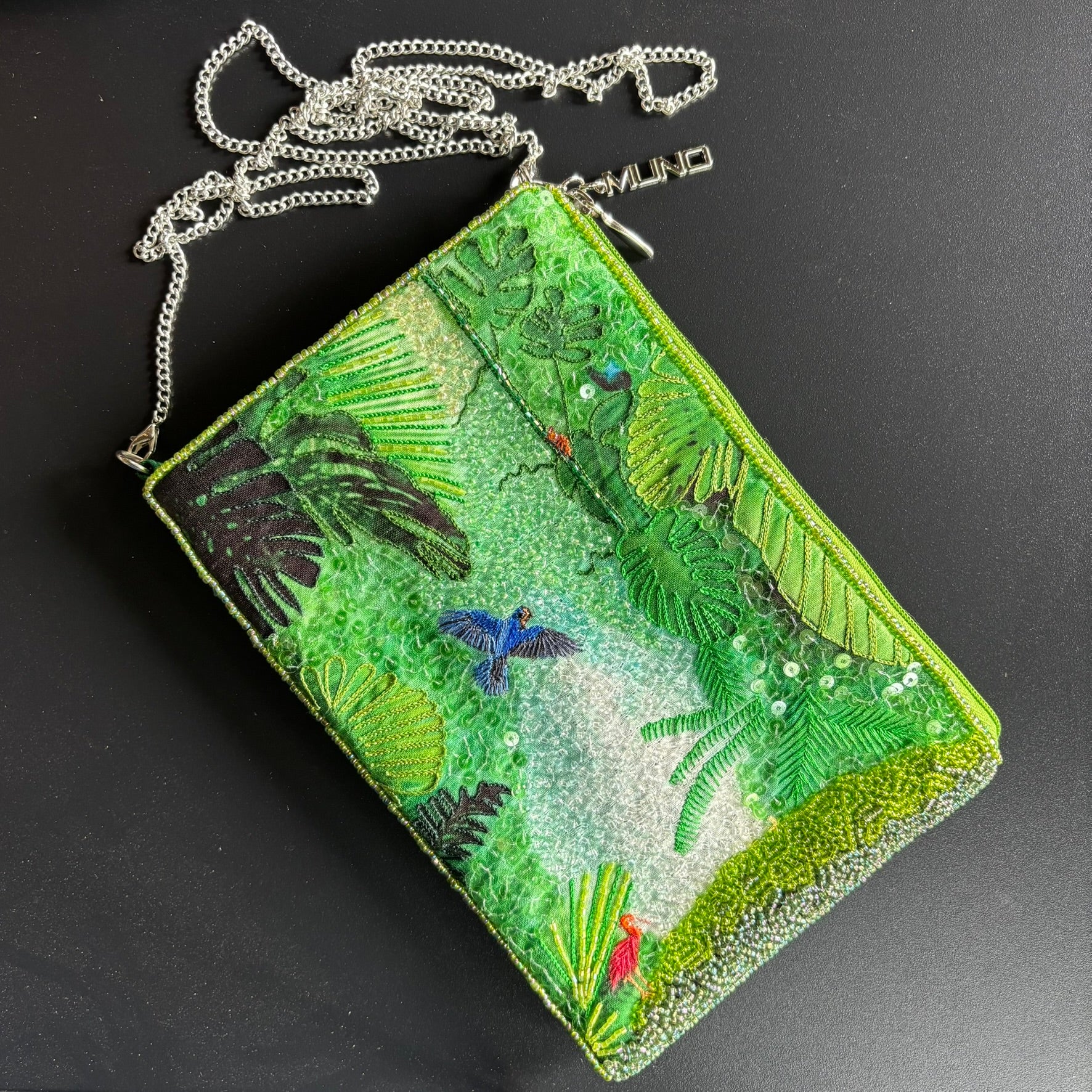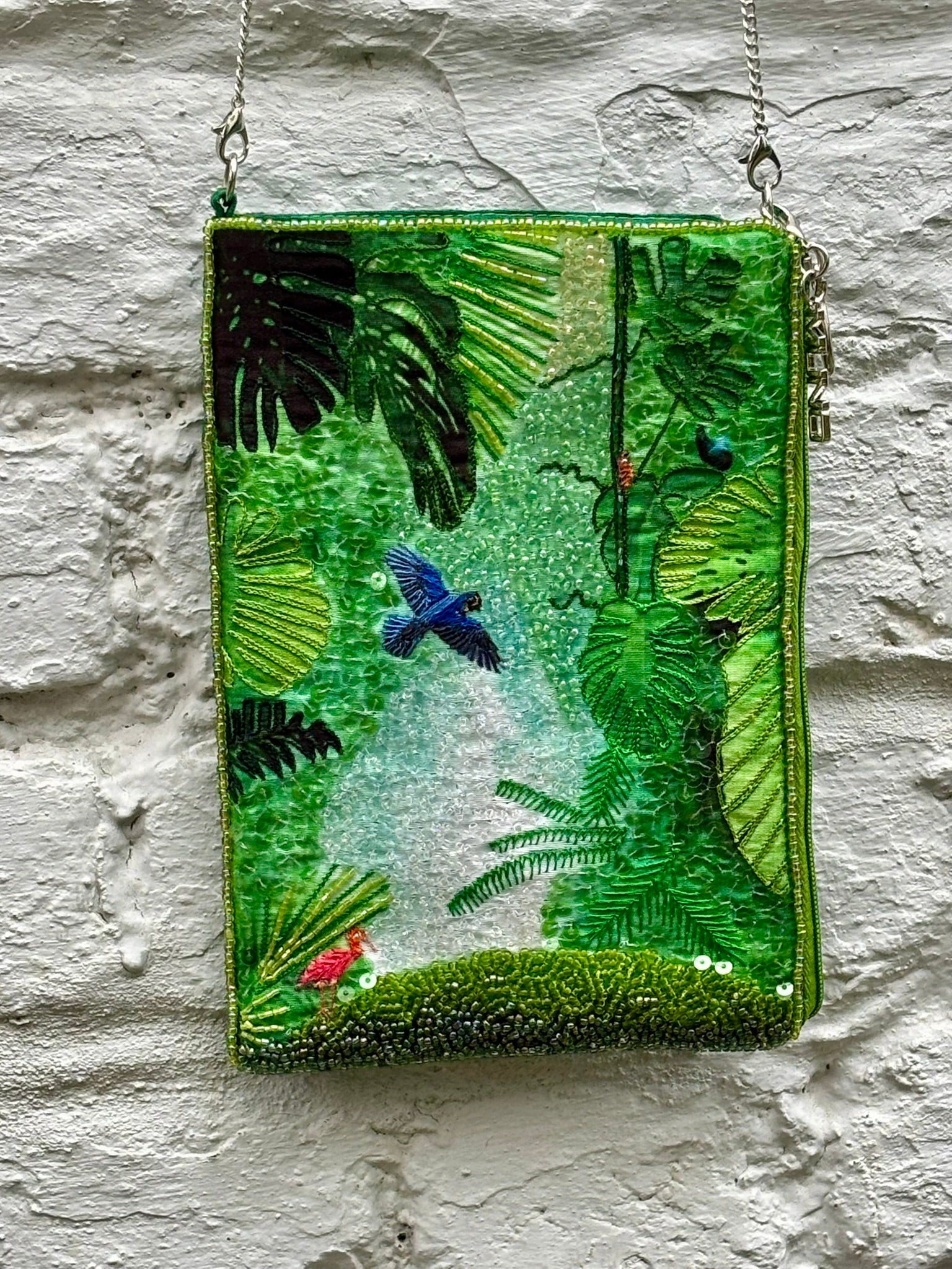 Step into a lush green paradise with our Jungle Dreams Hand-Embroidered Cross Body Bag. This exquisite piece is crafted from luxurious silk and adorned by hand with intricate beadwork, sequins, and detailed embroidery, bringing a vibrant jungle scene to life. The front features rich foliage and colorful bird motifs, while the back is finished with smooth, elegant silk for a refined touch.