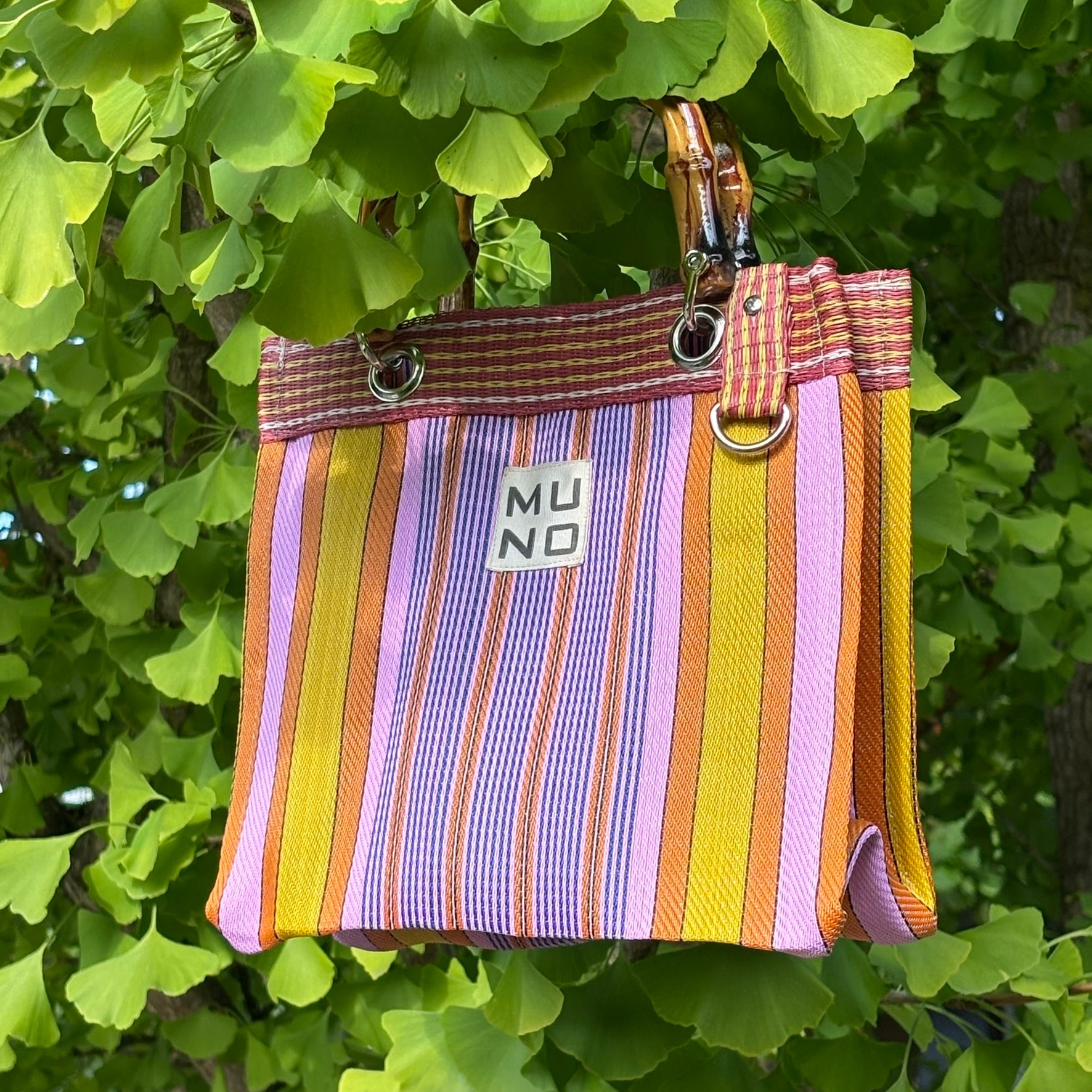 A Mini Tote with a lively combination of lilac, saffron yellow, burnt orange, raspberry red, and sky blue stripes. This joyful palette is both playful and bold — perfect for adding a splash of color to any outfit.