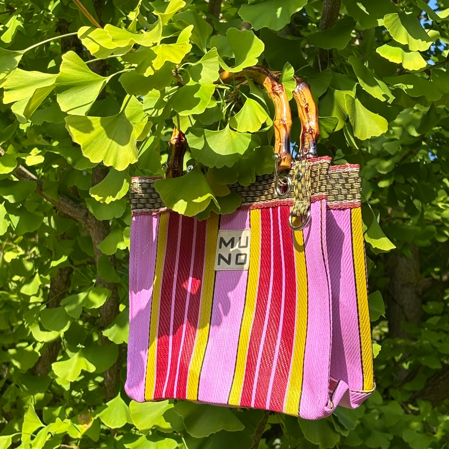 Add a bold, sunny accent to your look with this eye-catching Mini Tote. Handmade from recycled nylon, this bag is both sustainable and stylish. It features a striking bamboo handle, a magnetic closure, and silver hardware for a refined finish. Surprisingly spacious despite its compact size (21 x 24 cm) — it easily carries all your daily essentials. A vibrant mix of fuchsia pink, cherry red and yellow stripes. Bold, playful, and full of tropical flair — a true statement piece that radiates joy and energy.