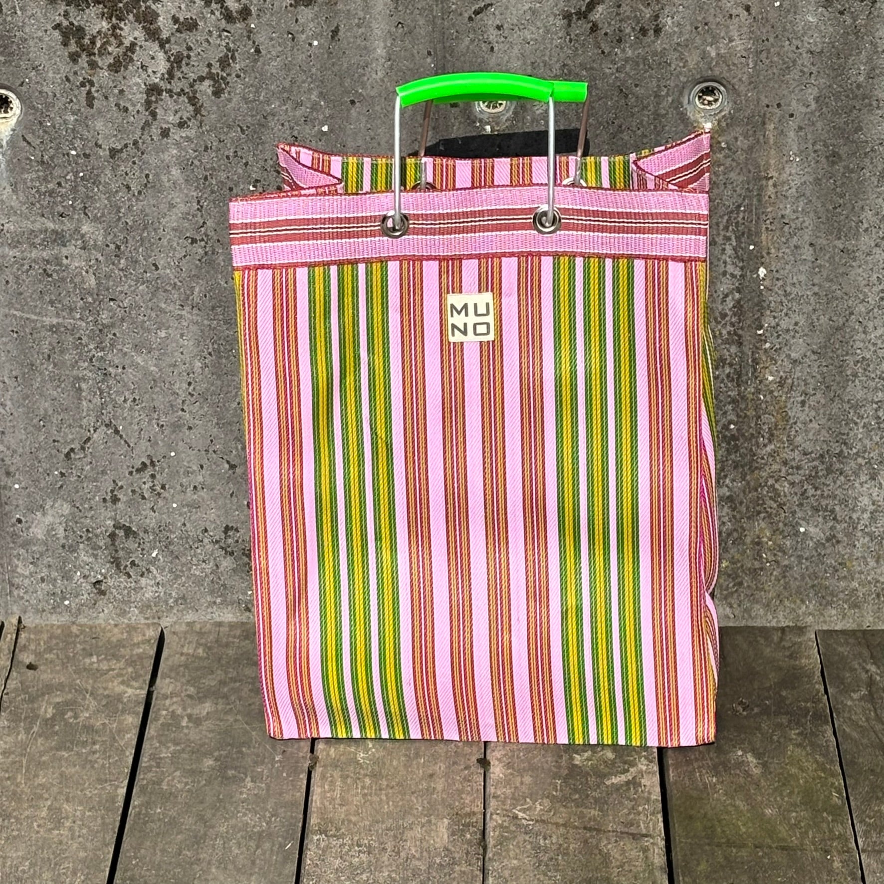 Bright, bold, and eco-friendly – the MUNO striped shopper is crafted from durable recycled nylon and finished with a sleek aluminum handle in a playful pop of color. Its generous 35x45x20 cm size makes it the ideal companion for grocery runs, beach days, or everyday use, offering both strength and lightness in one stylish design. With its striking multicolor stripes and vibrant handle accents, this shopper brings together practicality, sustainability, and a unique statement look.