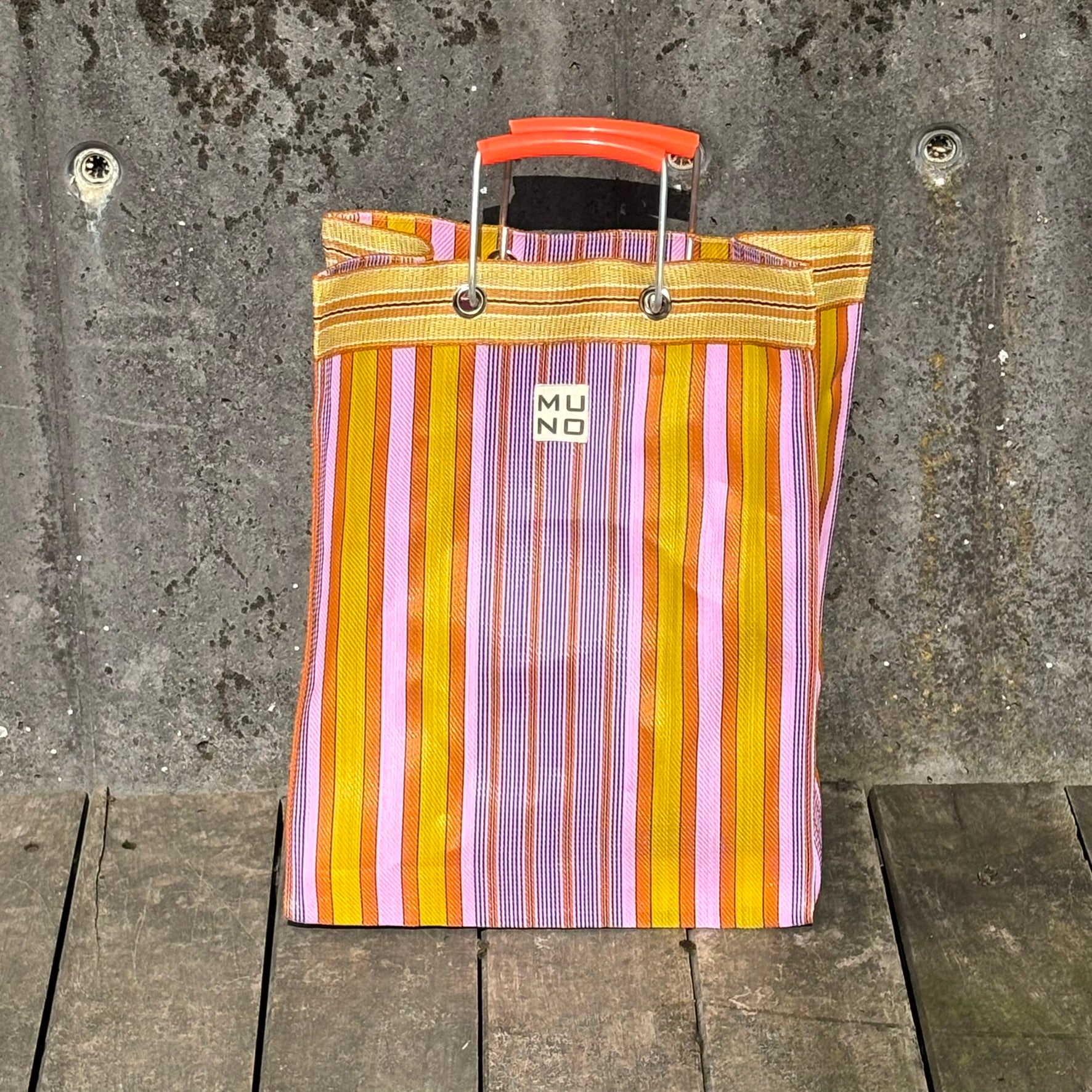 A Tote with a lively combination of lilac, saffron yellow, burnt orange, raspberry red, and sky blue stripes. This joyful palette is both playful and bold — perfect for adding a splash of color to any outfit.