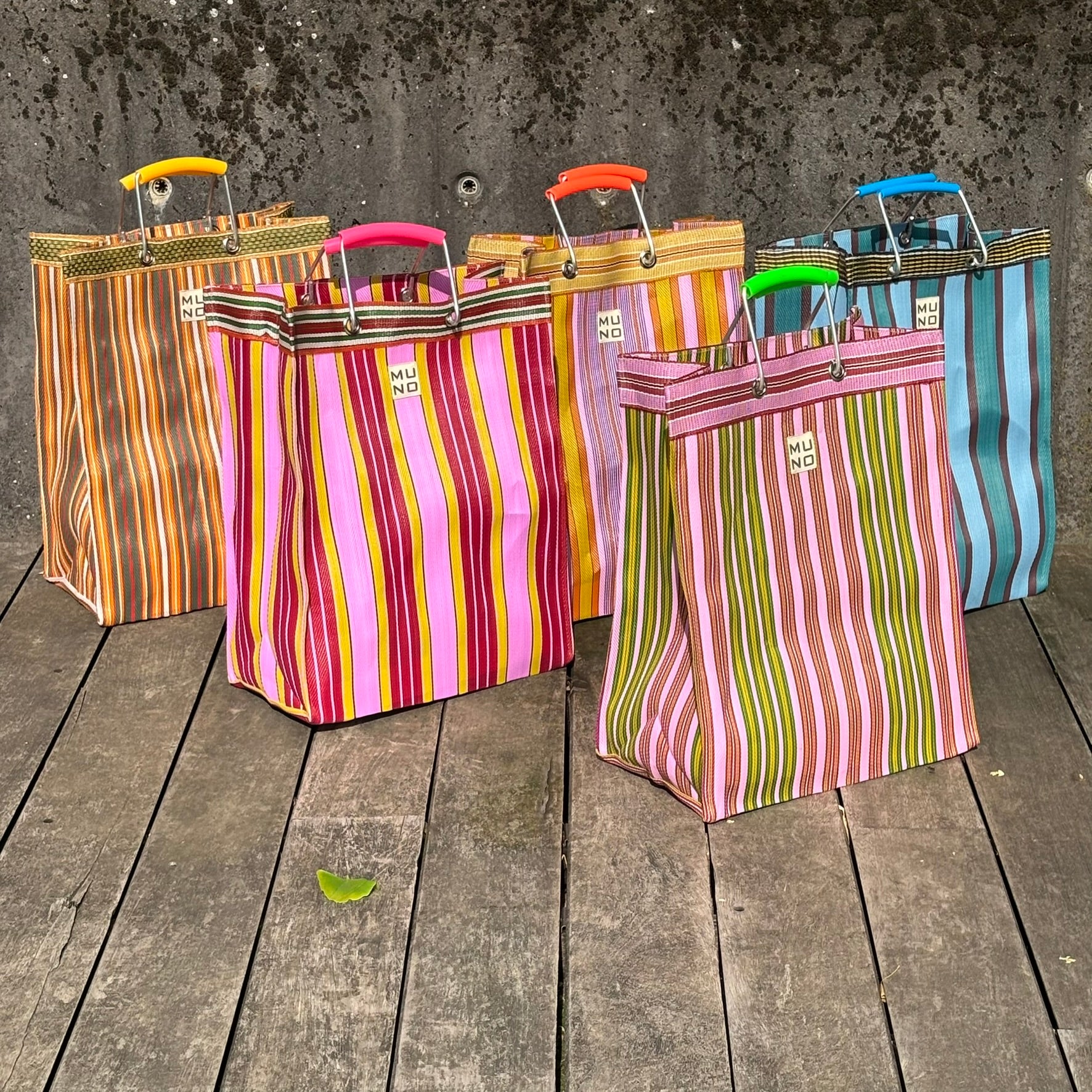 Bright, bold, and eco-friendly – the MUNO striped shopper is crafted from durable recycled nylon and finished with a sleek aluminum handle in a playful pop of color. Its generous 35x45x20 cm size makes it the ideal companion for grocery runs, beach days, or everyday use, offering both strength and lightness in one stylish design. With its striking multicolor stripes and vibrant handle accents, this shopper brings together practicality, sustainability, and a unique statement look.