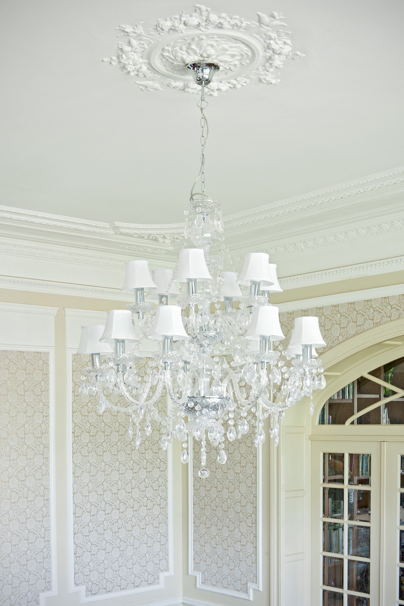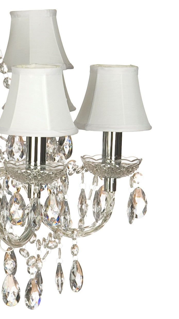 Chandelier à la fois contemporain et romantique. Ce lustre baroque Roméo est en acrylique à 15 branches et 15 lumières/ abat- jour en coton assortis.